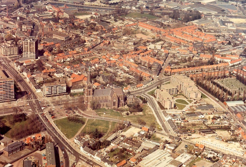 Heezerweg in 1980 (zie de straat die voor de kerk langsloopt en aan de rechterkant de foto verlaat)